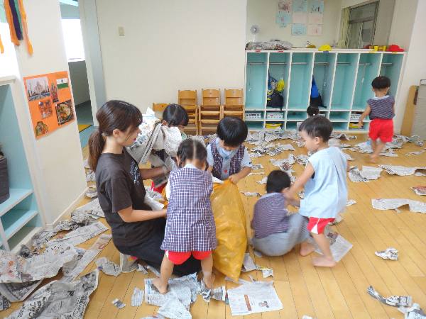 幼稚園では、年少クラスと満3歳クラスは身近な新聞紙で楽しみました!!