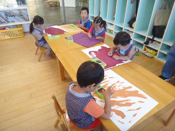 満3歳クラスは絵の具でのびのび描いた大きな『おいも』にクレヨン描き😊年長クラスは『秋の遠足』を思い出して、描画の活動を楽しみました🎵