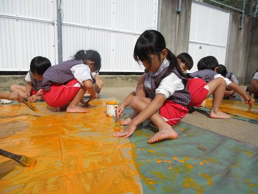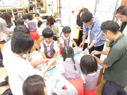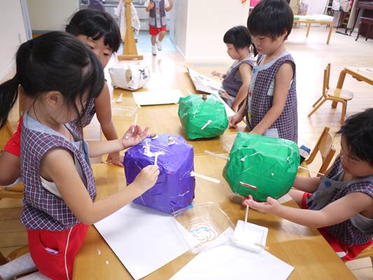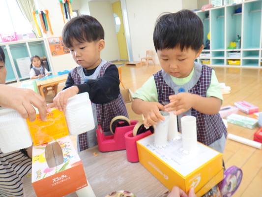 各クラスの制作あそび☺セロハンテープ、ボンド、絵の具、障子紙・・・様々な道具や材料を使い分けて生活素材が変身していくことを楽しんでいます💗