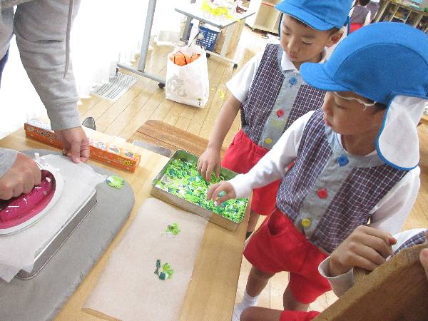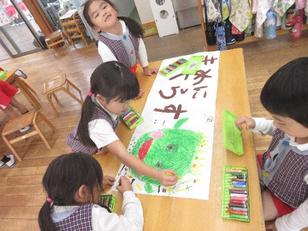 『さんさんこども祭り』まであと4日!!年長クラスはみんなのために💗そして、豆レンジャーとして、笑顔満点タイムのための制作中😊💗幼稚園の最年長児として頑張っています💪