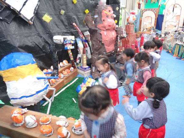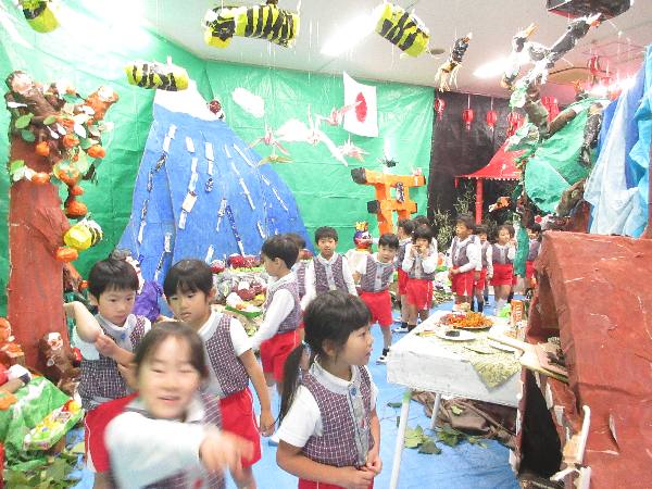 全学年、日曜日のさんさんこども祭りを振り返りながら😊ホール『豆スポランド』をワクワクした気持ちで💗見て周りました👀照明が当日よりも明るかったので、新たな発見もあったかな??