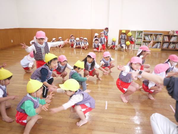 満3歳クラスは広いホールで朝のアセンブリー✨その後、年少クラスも一緒に💗ピアノの音に合わせて全身を使ってリズム遊びを楽しみました🎵