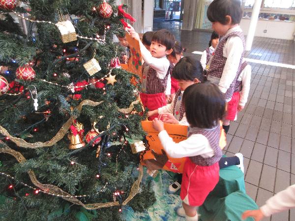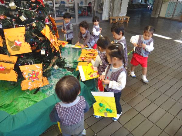 もくもく広場のクリスマスツリーの下には自分のクリスマスブーツを飾りました🎄お空の上のサンタクロースさんにみんなの思いが届きますように💗
