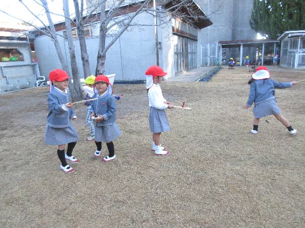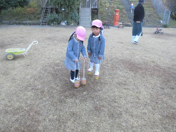 園庭に竹ぽっくりや羽根つきなど、冬の遊びが登場し、楽しんでいる子どもたちです😊