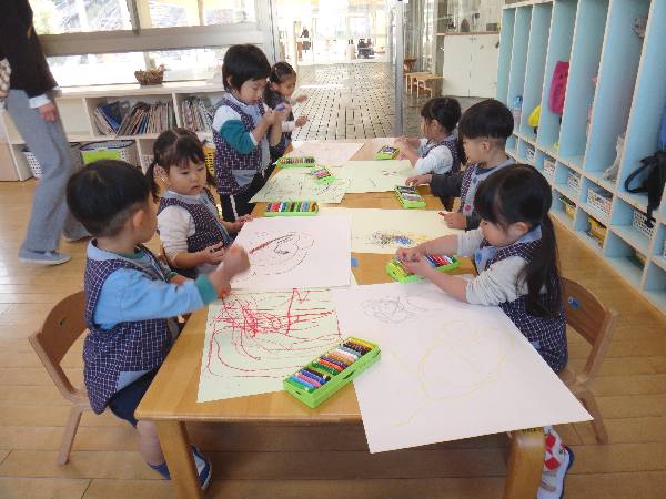 満3歳児クラスは、昨日の豆まきの絵を描きました!大きい画用紙に心に残ったことをクレヨンで表現します🎵