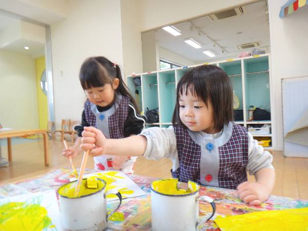 満3歳児クラスはホールでアセンブリーや集団遊び🎵いつもと違う場所での活動に「わくわくする~!」と嬉しそうな子どもたち💗絵の具遊びも楽しみました😊