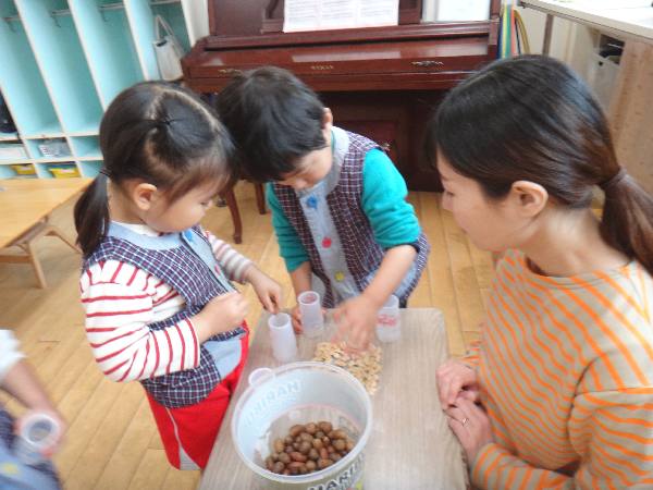 クリエイティブタイムで満3歳児はマラカス作り!マジックで絵をかいてどんぐりを入れて🎵どんな音が出るかな??😊