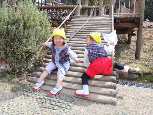 年長クラスは、春から作り始めて完成させた自分のポシェットを肩から下げて👜学園内のお散歩へ♪その後『冒険の森』にも入りました(*^▽^*)友だちと一緒に卒園に向けてたくさんの思い出を作っています💗