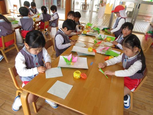 年中クラスは次に入園してくる年少クラスさんのためにチューリップを作りました🌷それぞれの春を楽しんでいます☺