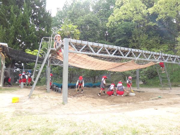 気温が高くなり半袖のお友だちが増え、薄着に変わってきています👕暑い日でも涼しく遊べるように💗砂場に遮光ネットも登場(^O^)✨大自然の中での遊びをこれからもたくさん楽しんでいきます🐛🔍