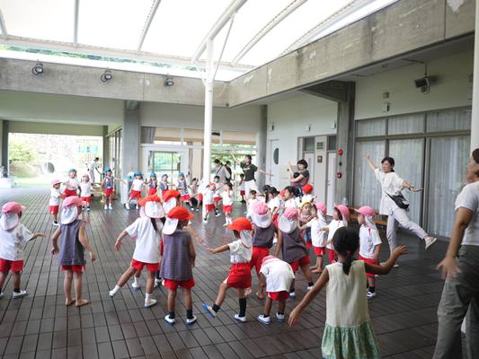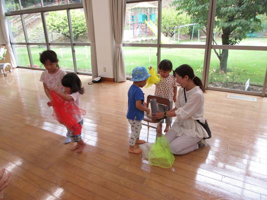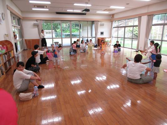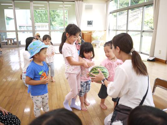 みんなでダンスを踊った後は大きなスイカ🍉を観察👀持ってみたり触ってみたり💪どんな味かな~?中身は何色かな~と想像が広がります💭その後はスカーフを使って自由に遊びました✨布1枚でも遊び方はたくさん💗子どもたちとおうちの方の笑顔が見られ 楽しい時間になりました😄